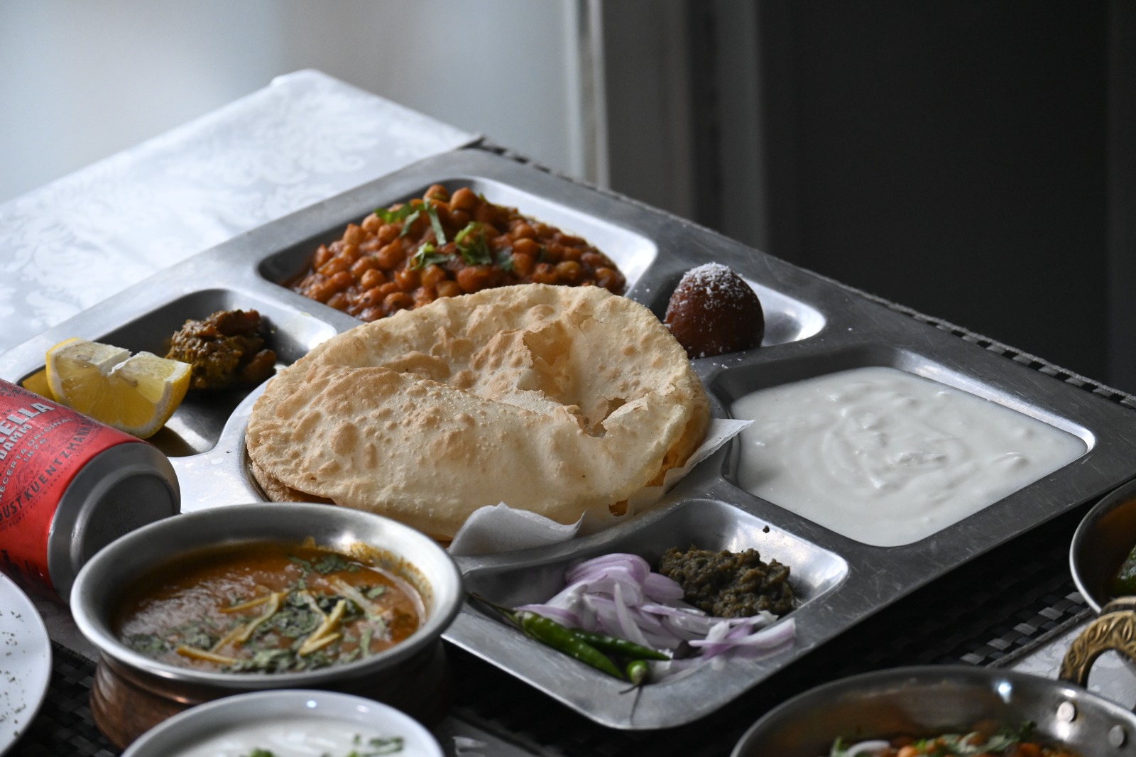 Garbanzos al curry servidos con pan frito de trigo y ensalada | Cigrons al curri servits amb pa fregit de blat i amanida
