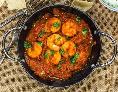 Llagostins amb abundant ceba, tomàquet i espècies. Llangostino con abundante cebolla, tomate y especias.